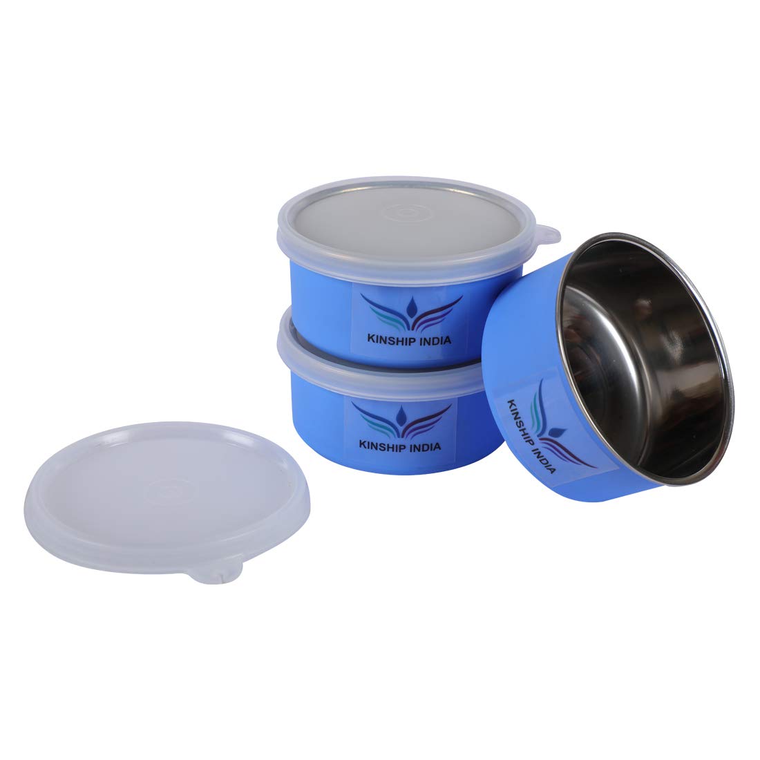This set of Small Microwave Safe Stainless Steel Containers shall help you in keeping your food hot and safe. Containing 3 x 11 Cm Bowls each having a capacity of approx. 300 ml with Airtight Spill proof Lids . The Containers have a Steel Interior and Transparent Plastic Coated Exterior and can be used easily for easily re-heating food at Office / Home in the Microwave WITHOUT lid. The Hard Plastic gets heated first which in turn heats up the Stainless Steel in which your food is absolutely safe and free of any toxins. So Go Ahead and Buy Yourself a Set!! Care Instructions - Hand Wash Recommended with Mild Detergent and Soft Brush. Do Not use wire mesh pads to clean which might scratch the surface. Use in the Microwave only for Re-Heating Without Lid.