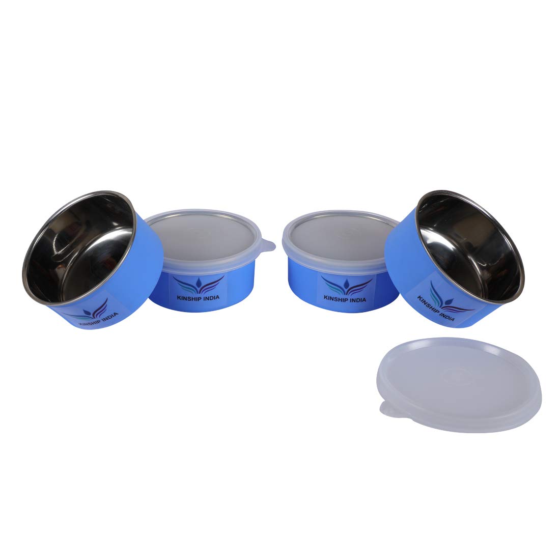 This set of Small Microwave Safe Stainless Steel Containers shall help you in keeping your food hot and safe. Containing 4 x 11 Cms Bowls each having a capacity of approx. 300ml with Airtight Spillproof Lids . The Containers have a Steel Interior and Transparent Plastic Coated Exterior and can be used easily for easily re-heating food at Office / Home in the Microwave WITHOUT lid. The Hard Plastic gets heated first which in turn heats up the Stainless Steel in which your food is absolutely safe and free of any toxins. So Go Ahead and Buy Yourself a Set!! Care Instructions - Hand Wash Recommended with Mild Detergent and Soft Brush. Do Not use wire mesh pads to clean which might scratch the surface. Use in the Microwave only for Re-Heating Without Lid