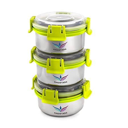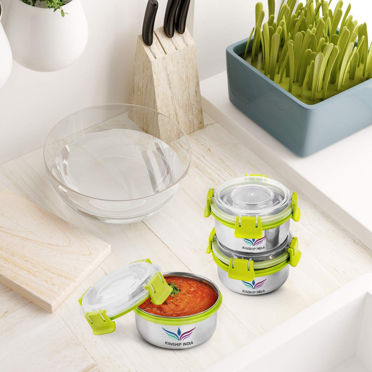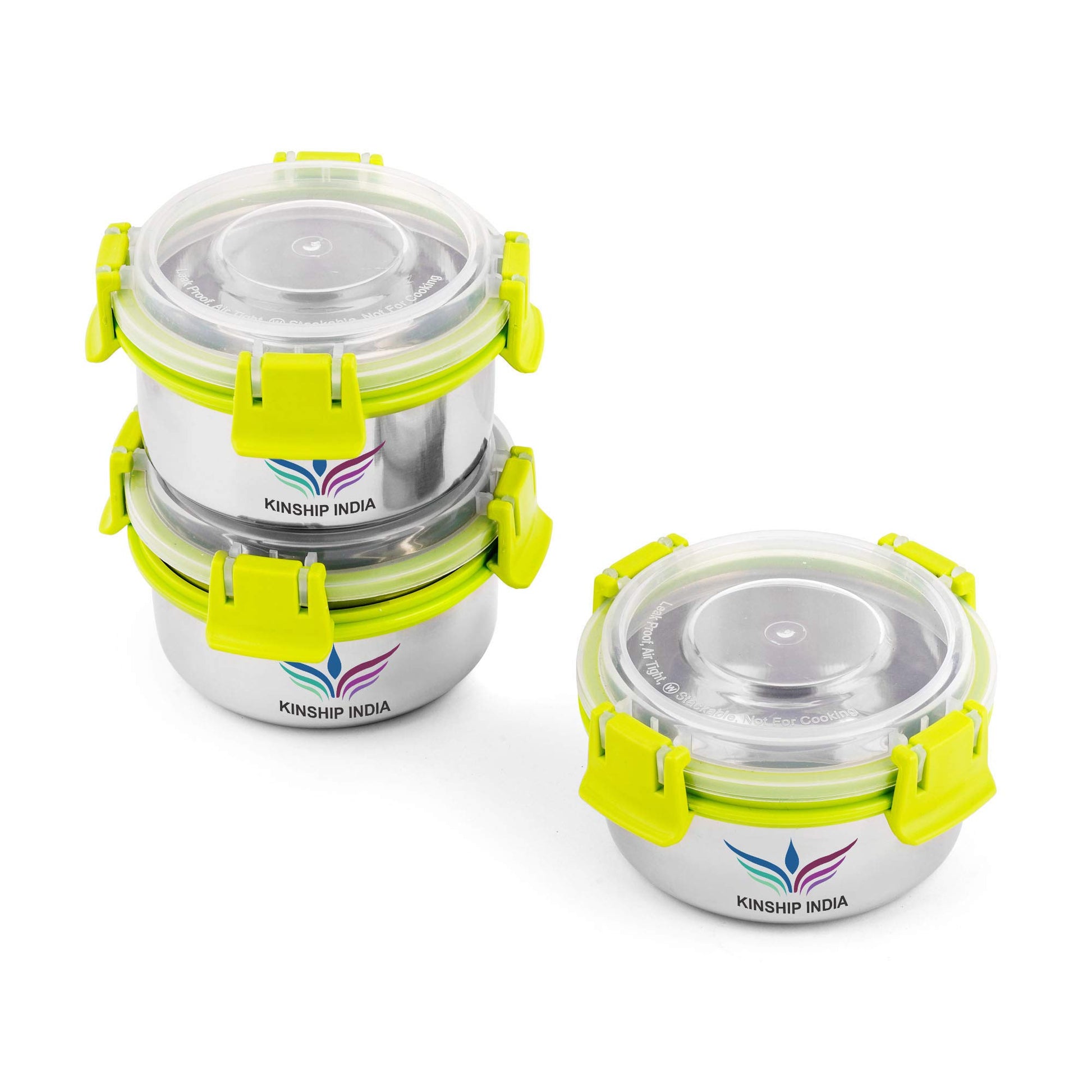 Stainless Steel Smart Lock Lunch Container Set of Three (300 ml,10 cm)(GREEN)